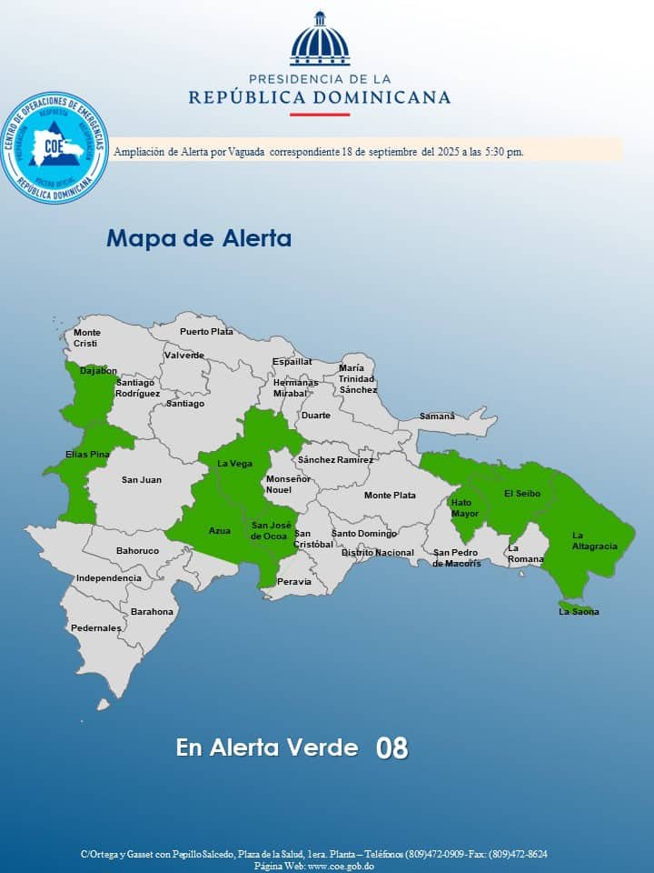 El Centro de Operaciones de Emergencias (COE) elevó a ocho el número de provincias en alerta verde, debido a la incidencia de una onda tropical localizada sobre Haití, la cual, en combinación con una vaguada, está provocando lluvias sobre el territorio nacional.