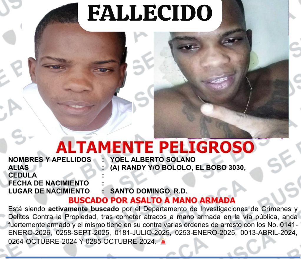 Se trata de Yoel Alberto Solano (a) Randy y/o Bololo y/o El Bobo 3030, era señalado por los investigadores como un asaltante recurrente que operaba en sectores como Guachupita, 27 de Febrero, La Ciénaga, María Auxiliadora y Los Guandules.